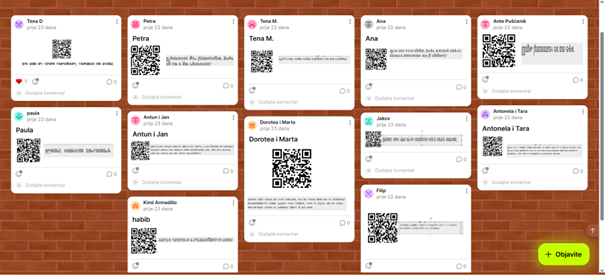 Svoje radove dodatno su obogatili izradom QR kodova koji vode do digitalnih sadržaja – transliteriranih citata. Na taj su način uspješno spojili tradiciju i suvremenu tehnologiju, pokazujući kako se kulturna baština može približiti novim generacijama na moderan i zanimljiv način. Još jednom smo povezali nastavu Informatike i Hrvatskoga jezika i surađivali s učiteljicom Informatike Vlatkom Bakarić.