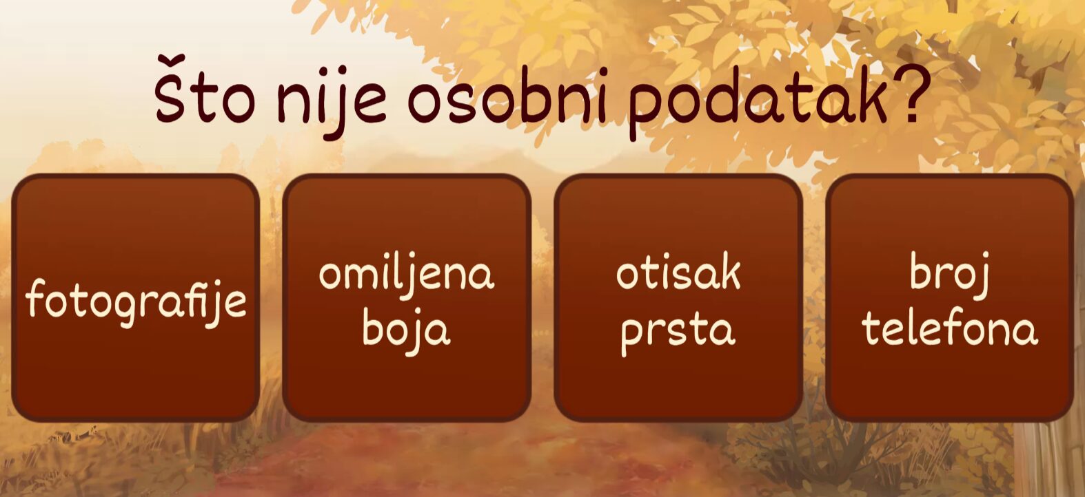U digitalnom svijetu važno je znati kako se zaštititi. Na internetu ne smijemo dijeliti osobne podatke poput imena i prezimena, adrese, broja telefona, fotografija, videozapisa ili otiska prsta jer se mogu zloupotrijebiti.