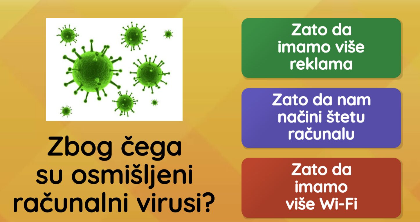 Na internetu možemo naići na programe koji se prikrivaju kao bezopasni, a zapravo mogu oštetiti računalo ili ukrasti podatke — to su računalni virusi. Mogu usporiti rad uređaja, obrisati važne dokumente ili poslati podatke nepoznatim osobama.