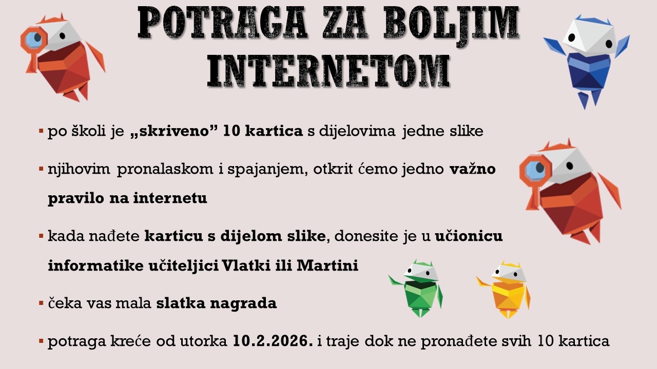 Tijekom cijelog tjedna u holu škole bila je organizirana Potraga za boljim internetom za učenike viših razreda. Po školi je bilo skriveno 10 kartica koje su činile jednu sliku. Njihovim pronalaskom i spajanjem otkrili smo važno pravilo: