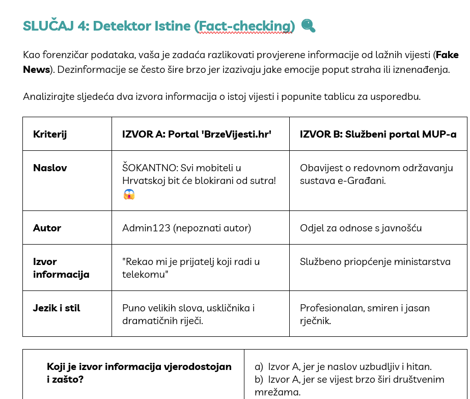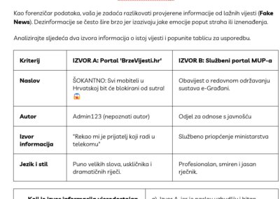 Četvrtaši su učili o lažnim vijestima (fake news) i načinima njihova prepoznavanja. Razgovarali smo o izvorima informacija, senzacionalističkim naslovima i važnosti provjere činjenica.