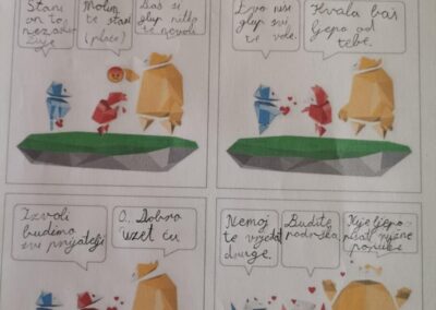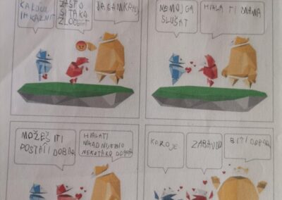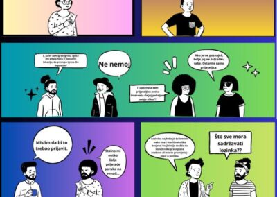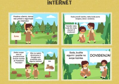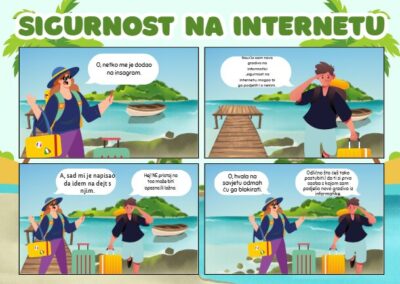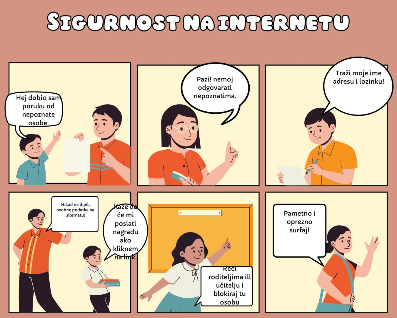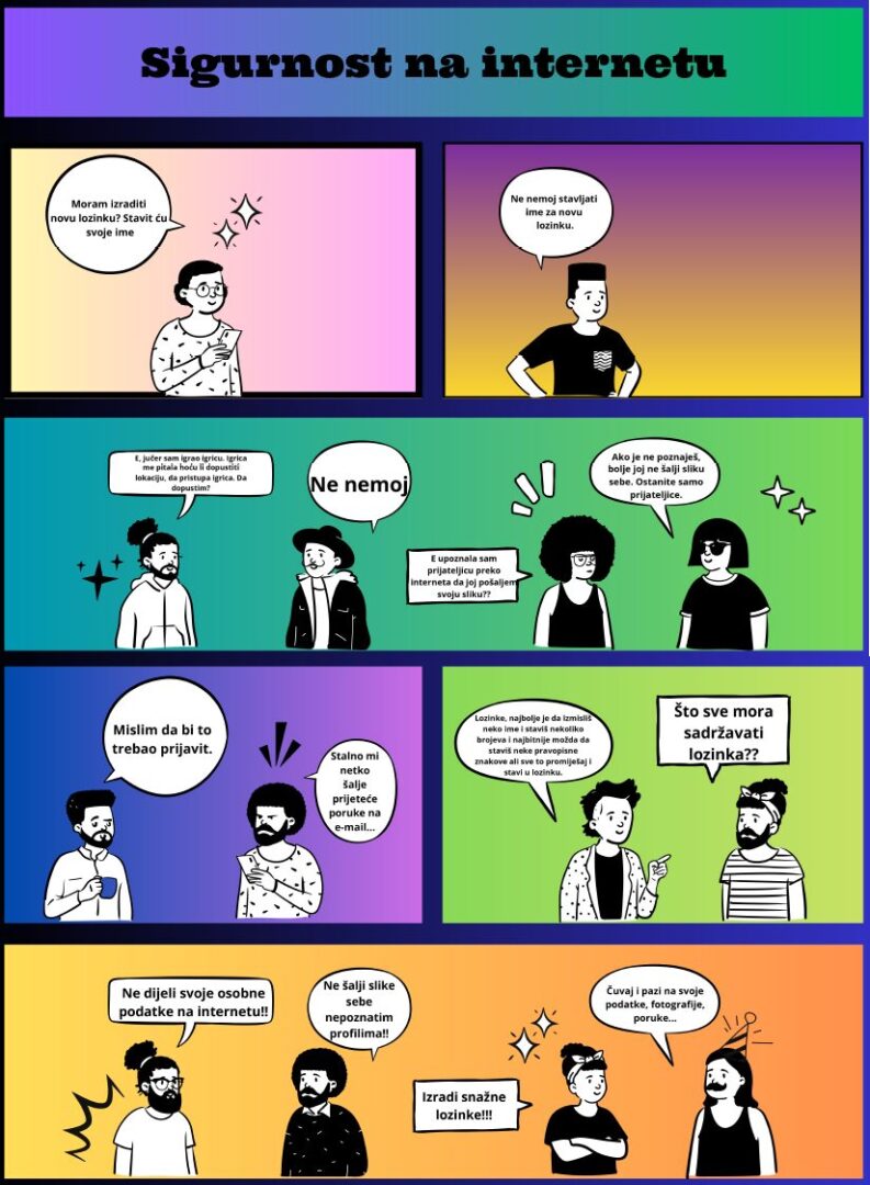 Učenici su prošli prezentaciju o sigurnosti na internetu te potom izrađivali stripove – digitalno u Canvi ili na papiru – prikazujući situacije poput prepoznavanja prijevare, zaštite lozinki i odgovornog ponašanja na društvenim mrežama.