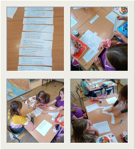 Učenici 4. razreda s učiteljicom Majom Zorić prevodili su himnu Voices of Europe, složili stihove u ispravan redoslijed, preveli ih na hrvatski jezik i na kraju su pjesmu otpjevali. Učenici 1. razreda razgovarali su o europskim državama i jezicima kojima se tamo govori, bojali zastavice, tražili države na karti te u veselom ozračju snimali i izgovarali pozdrave na različitim jezicima.