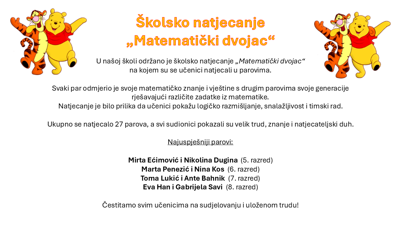 Učenici naše škole, Bartol Kotorac, Luka Jaković, Josipa Repinac i Marta Balešić danas su sudjelovali na županijskom natjecanju Sigurno u prometu. Natjecanje se sastoji od pisanog dijela (poznavanje prometnih propisa) i praktičnog dijela (vožnja biciklom po poligonu s...