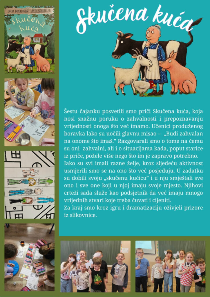 U produženom boravku s učenicima sudjelujemo u projektu Čajanka s tetom Juliom. Kroz čitanje slikovnica autorice Julie Donaldson, razgovaramo o prijateljstvu, zajedništvu, pomaganju drugima i prihvaćanju različitosti. Projekt obogaćujemo zajedničkom čajankom, kreativnim zadacima i suradničkim radom.