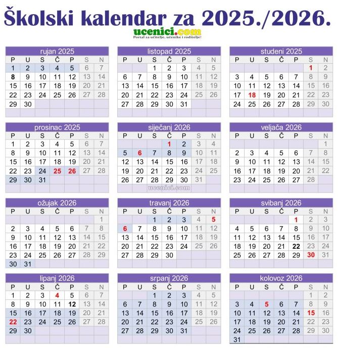 Praznici u 2025./2026. raspoređeni su na sljedeći način: