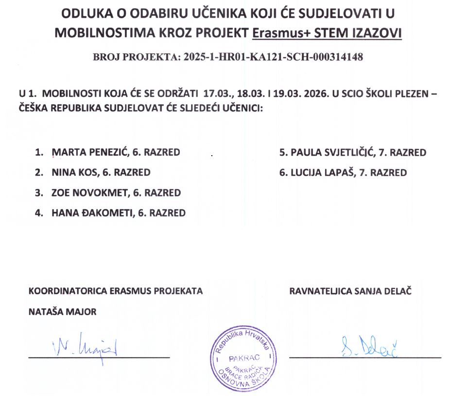 U sklopu projekta STEM izazovi donesena je odluka o odabiru učenika koji će u ožujku sudjelovati u mobilnosti u Češkoj.