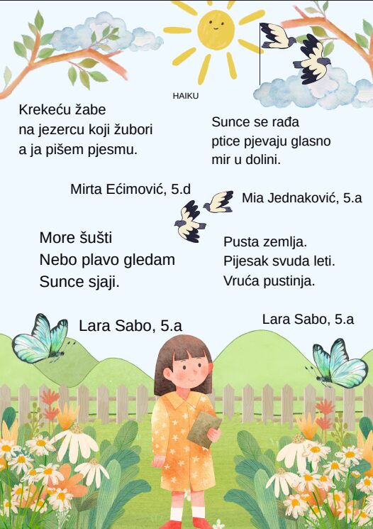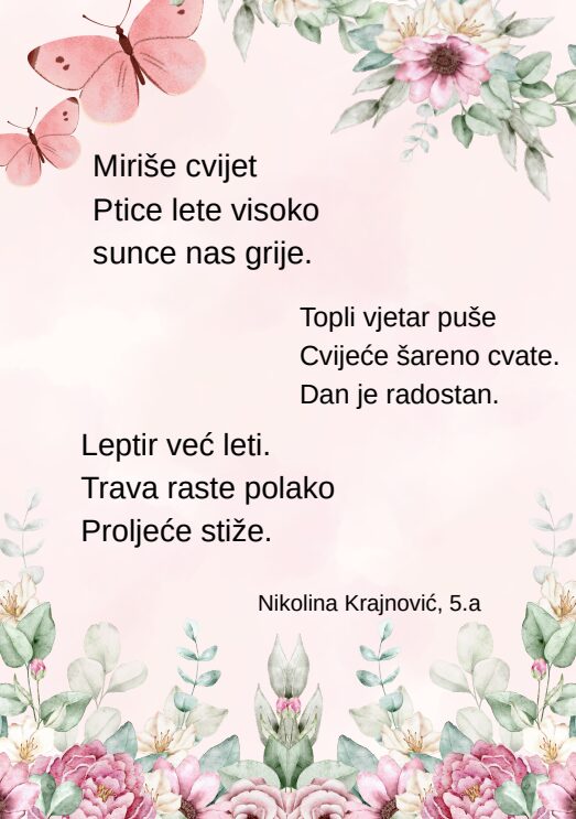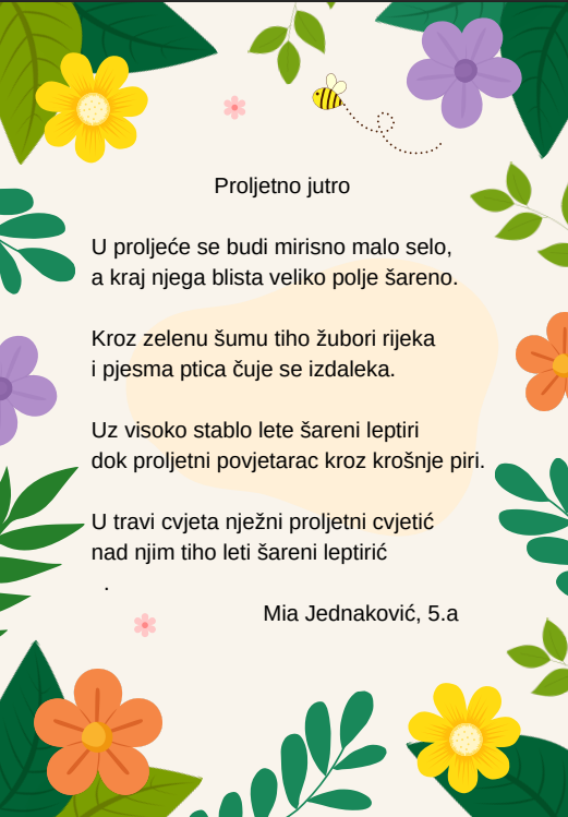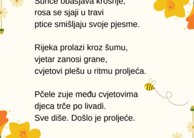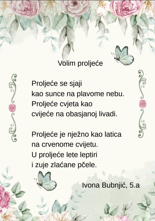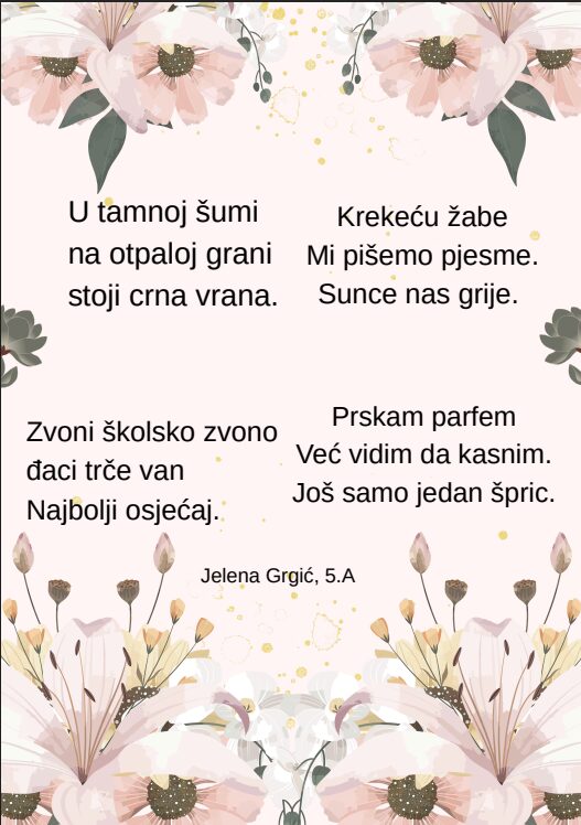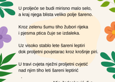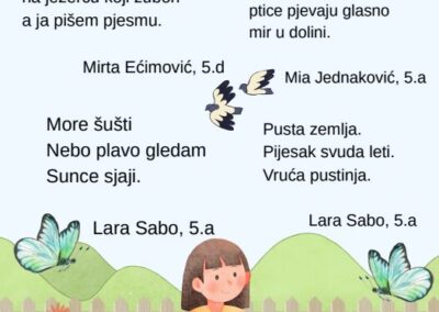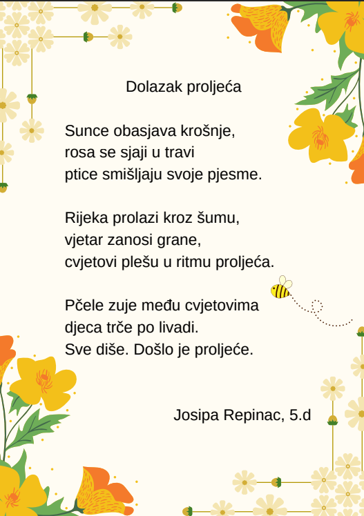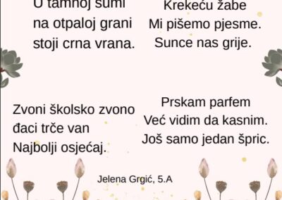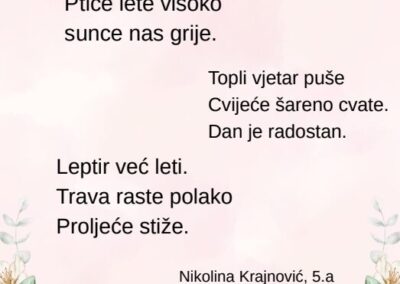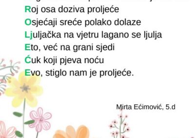 Kroz različite pjesničke forme i kreativne zadatke, učenice su izrazile svoje misli, osjećaje i doživljaj proljeća na jedinstven i nadahnut način. Njihovi stihovi svjedoče o maštovitosti, osjetljivosti i ljubavi prema jeziku i književnosti.